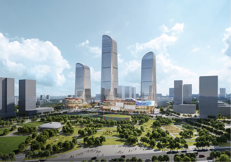 公司參與設計的55、57號地塊項目位于石家莊高鐵片區商務核心區,正對石家莊站東廣場,項目總規劃用地面積106.35畝,設計以“山石為形”、取“昂揚向上”之意,由一主兩副三塔和裙房組成,建成后將成為石家莊市第一高樓。其中,57號地塊總建筑面積45.9萬平方米,規劃建設主塔高258米,副塔高200米;55號地塊總建筑面積20.6萬平方米,規劃建設塔樓高180米。項目通過空中連橋、地下商業與地鐵聯通,打造高品質購物、娛樂的多維立體商圈,建成后將成為集高端購物、會議展覽、商務辦公、休閑住宿等多功能于一體的地標建筑,重塑城市天際線,成為石家莊市經濟提升新動能。